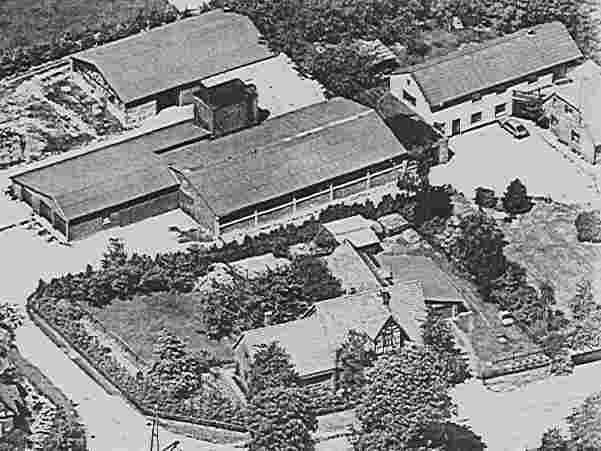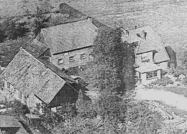 Das Bild zeigt auf der linken Seite die Werkstatt mit dem Anbau. Oben links ist die neu eingerichtete Garage zu sehen. Das mittlere Gebäude beinhaltet immer noch einen Stall. Auf der rechten Seite sieht man das Wohnhaus. Unten rechts ist das Vollholz – Freiluftlager zu sehen.